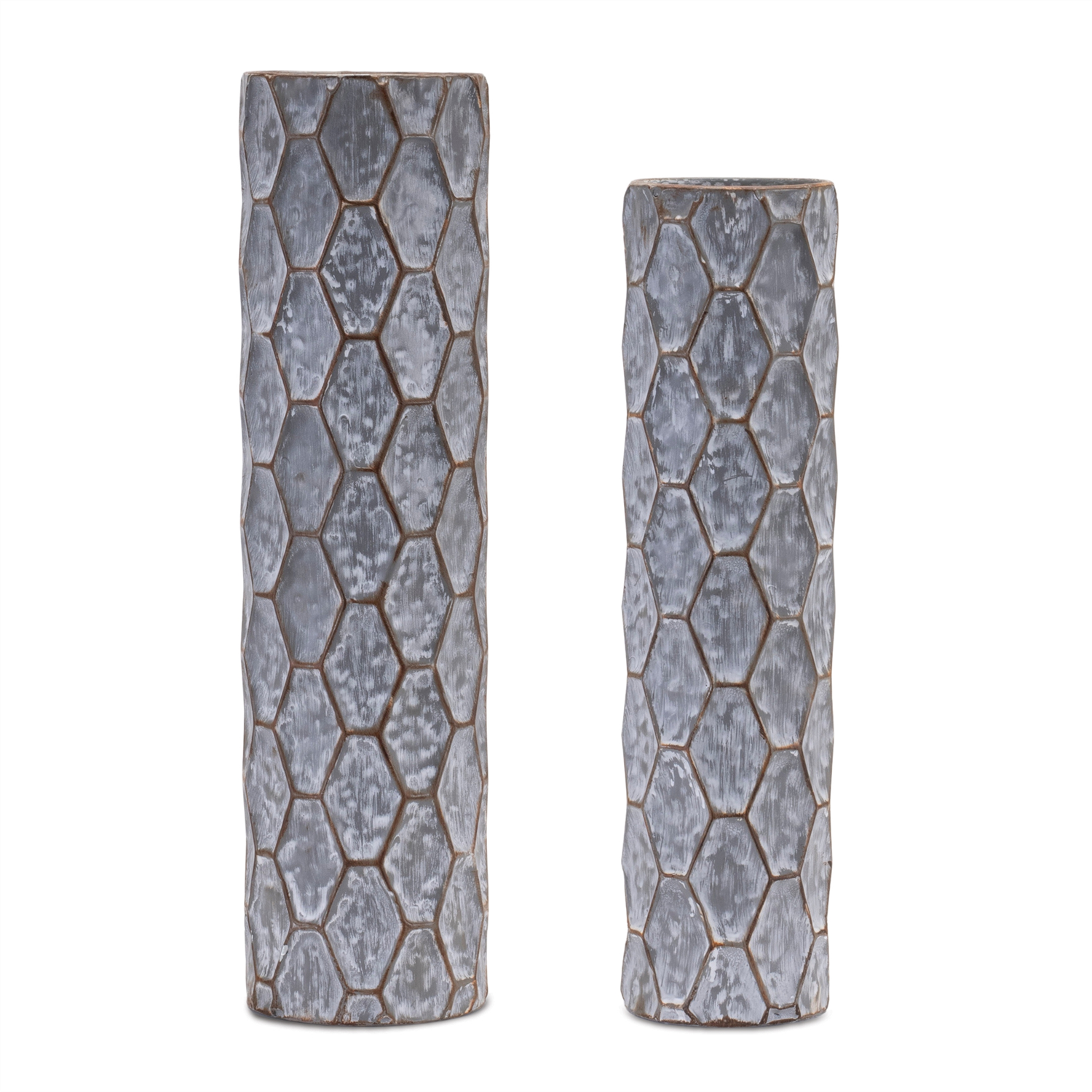 Elevate your home decor with the Rustic Honeycomb Metal Taper Candle Holders. This sophisticated set of two features an intricate honeycomb pattern and a distressed whitewashed finish, perfect for modern farmhouse and rustic styles. Crafted from durable metal, these candle holders provide a timeless look while ensuring longevity. Display them on your mantel, dining table, or entryway to create a warm and inviting ambiance. Simply add a 1" taper candle—real wax or LED—to complete the look. (Candles sold separately.) Sold in a set of two assorted designs to create a balanced display in your home.